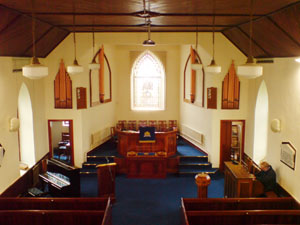 Organ divided in chambers on either side of chancel area (Tuba + 16' basses in left chamber & main ranks in right chamber)