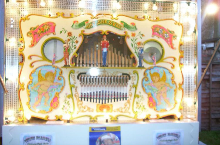 The facia of the Organ was decorated by the well known Fairground artist Mr Neddy Matthews to the design of the first owner, she is called "Aint She Sweet" and she really is, the sound is wonderful, you see the Bandsman, his right arm holding the Baton moves in beat with the music playing, as does the Ladies holding the Bells, - when in operation the Castanets operate as with the drums and Glockenspeil and all the others instruments within.