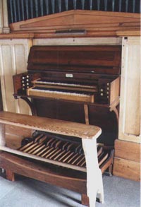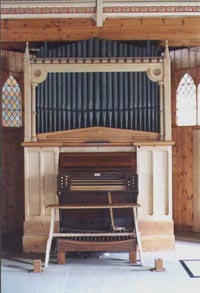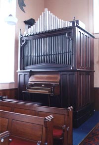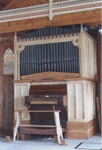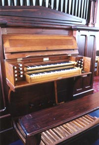 Organ against 'west' wall of church on 'south' side with attached drawstop console (player faces 'west')