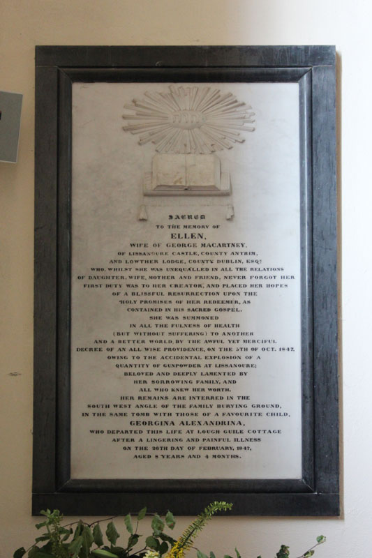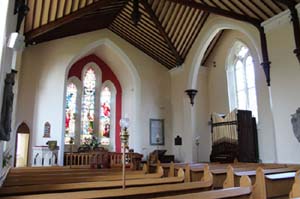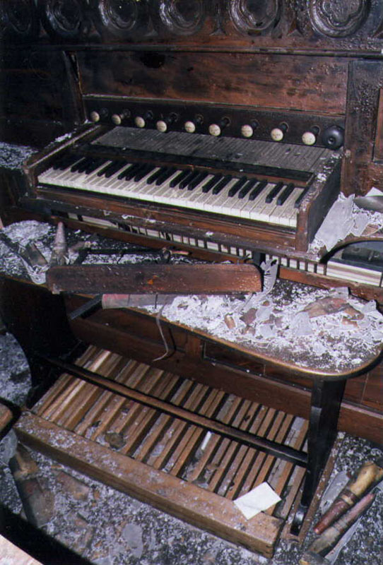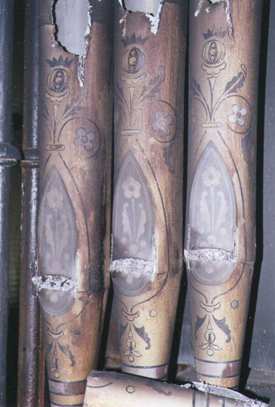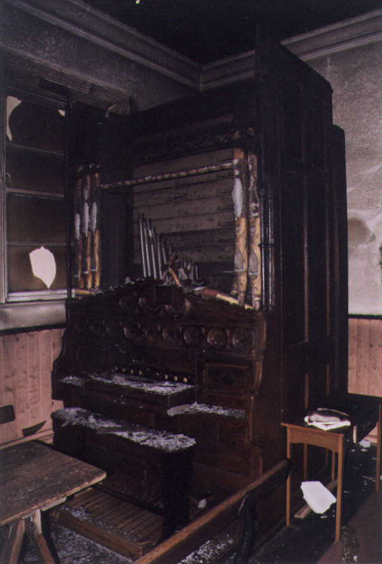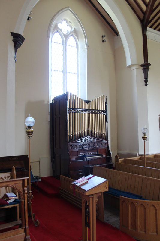 The 1870 Cramer Wood & Co. organ was seriously damaged by fire in 2001 in Aghalee Parochial Hall, Co. Antrim. It was removed to store and remained so for 12 years until the ideal possibility arose for a home in Loughguile. Only ever having an Alexandre harmonium in use since the 1850s, Loughguile was considering ways to improve the musical portion of the services as the harmonium was giving trouble. Restoration commenced at the start of 2013 with making 21 new metal front pipes to replace the ones which melted in the fire. The soundboard, bellows and casework all required substantial restoration and the pipes were revoiced flatter to standard pitch involving lengthening some ranks and transposing others. Installation in the church was completed in July 2013.