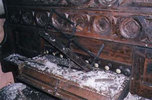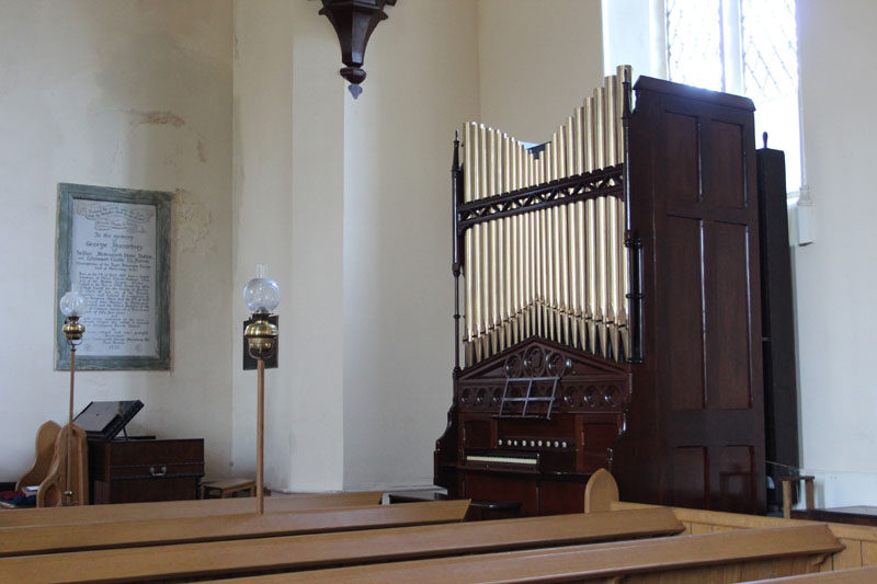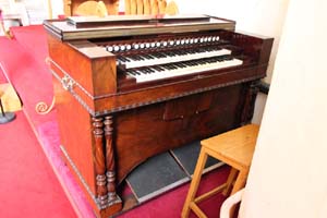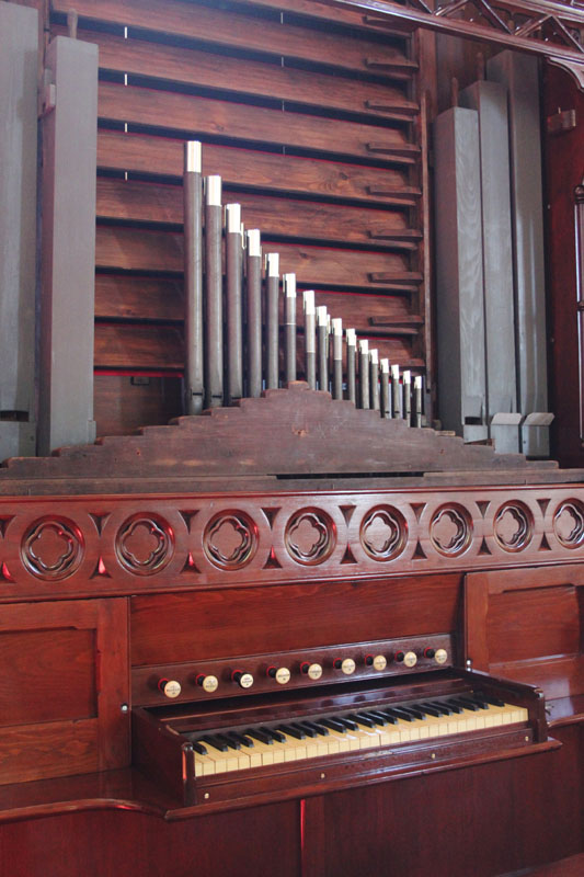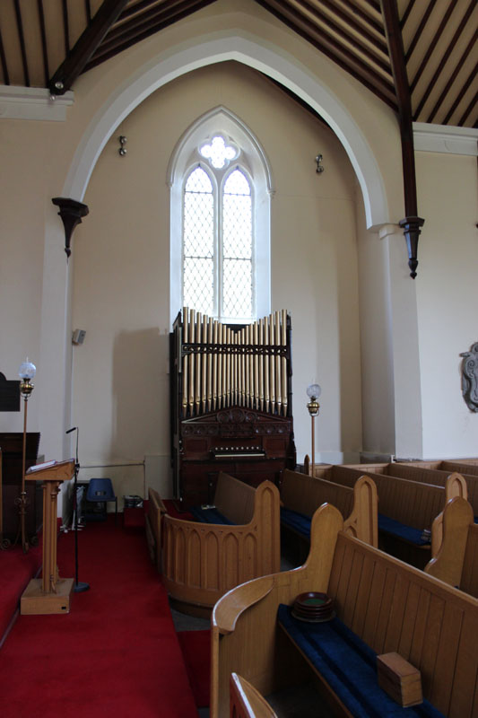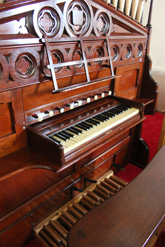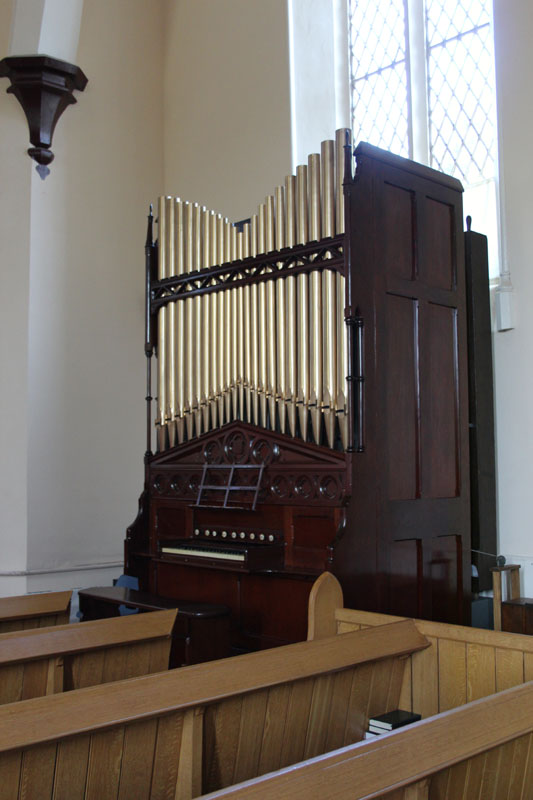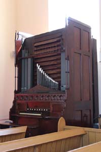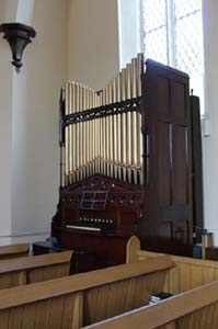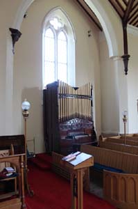 Organ against south transept wall of church with attached drawstop console (player faces south)