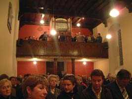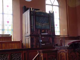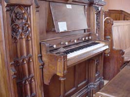 Organ on west gallery of church with attached drawstop console (player faces west)